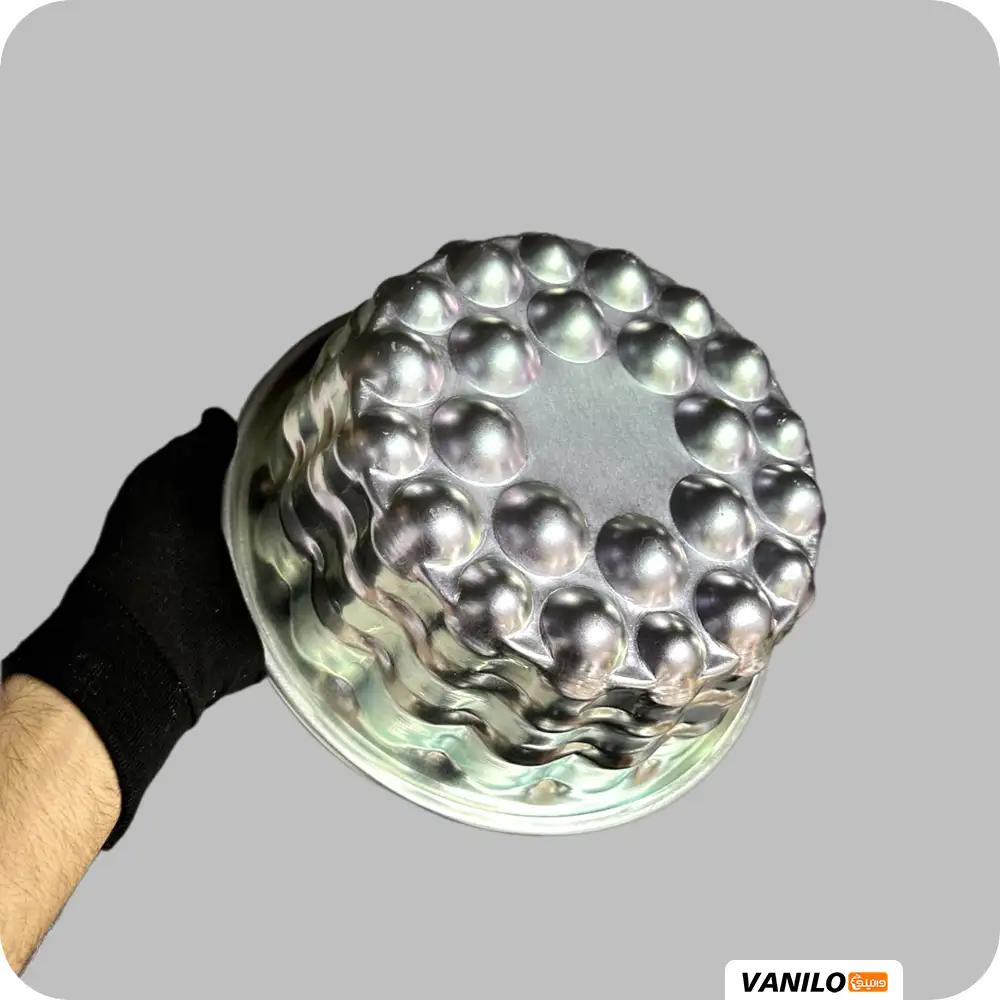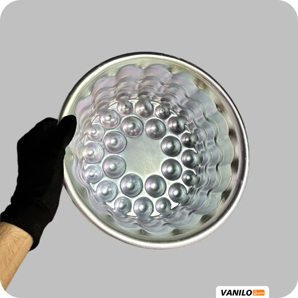 این قالب برخلاف قالبهای کروی دو تکه، یک قالب یکپارچه است که در دیوارهها و کف آن، برجستگیهای نیمکرهای کوچک در کنار هم قرار گرفتهاند. وقتی کیک یا ژله را از آن خارج میکنی، سطح دسر شما شبیه به مجموعهای از حبابها یا توپهای برجسته و منظم میشود که ظاهری بسیار مدرن و «مینیمال» به خود میگیرد. قطر سر قالب ۲۶ سانت و ارتفاع ۱۰ سانت میباشد.