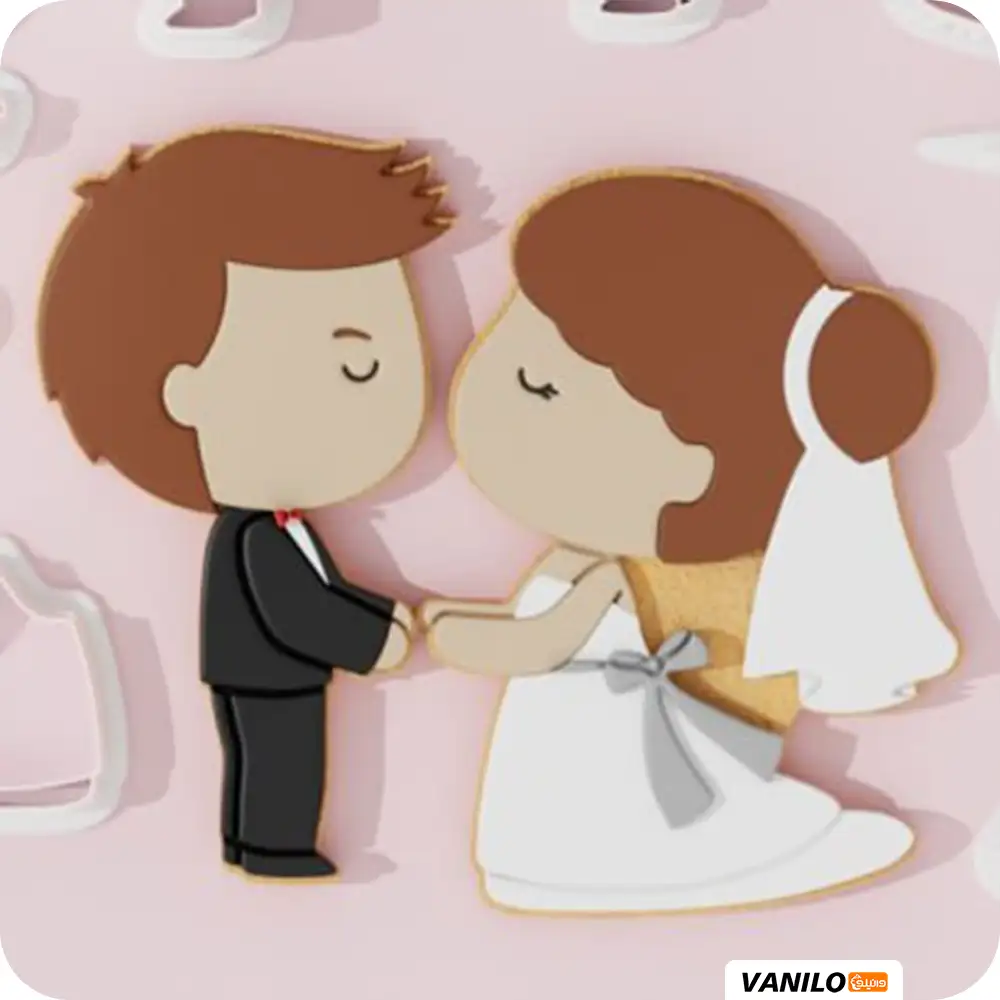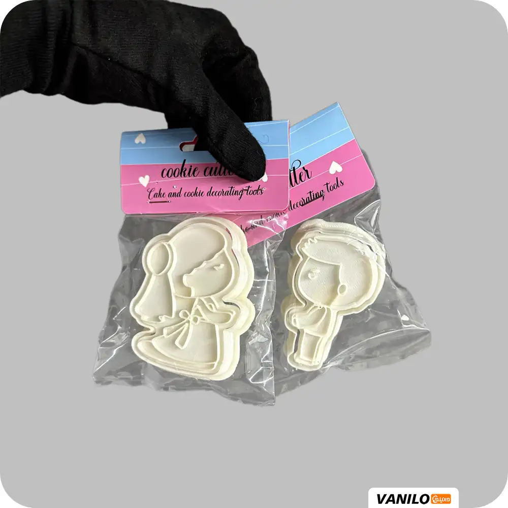 مهر و کاتر عروس و داماد مجموعهای از ابزارهای قنادی هستند که برای برش و ایجاد طرحهای سهبعدی یا برجسته روی خمیرهای مختلف مانند کوکی، فوندانت، مارزیپان و خمیر پلیمری استفاده میشوند. این ستها شامل کاتر (برای برش شکل کلی) و مُهر (استامپ) (برای ایجاد نقش و نگار روی سطح خمیر) با طرحهای مرتبط با مراسم عروسی و نامزدی مثل لباس عروس، کت و شلوار داماد، حلقههای ازدواج یا دسته گل هستند. کاربرد اصلی آنها تهیه کوکیهای تزئینی (گیفت) برای مهمانان، یا تزئین حرفهای کیک و دسرها برای جشنها است. سایز هر کاتر ۸ در ۵ در ۱ سانت میباشد.